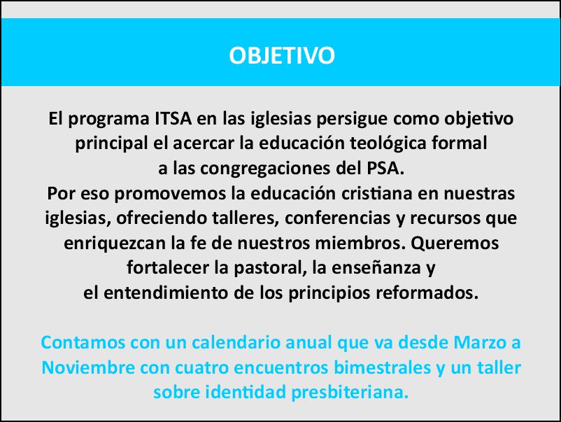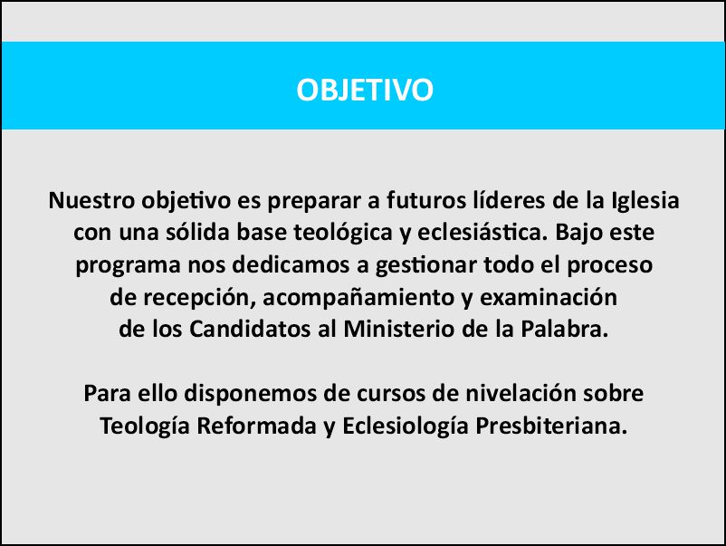 Nuestro propósito principal es edificar y equipar a las congregaciones presbiterianas, brindando recursos, formación y apoyo a los PM, PG y miembros. Pero también ofrecer educación teológica de calidad a todo el Cuerpo de Cristo. Queremos que cada persona encuentre en nuestras iglesias un espacio de crecimiento espiritual, educación sólida y compromiso con los principios de la fe reformada.
